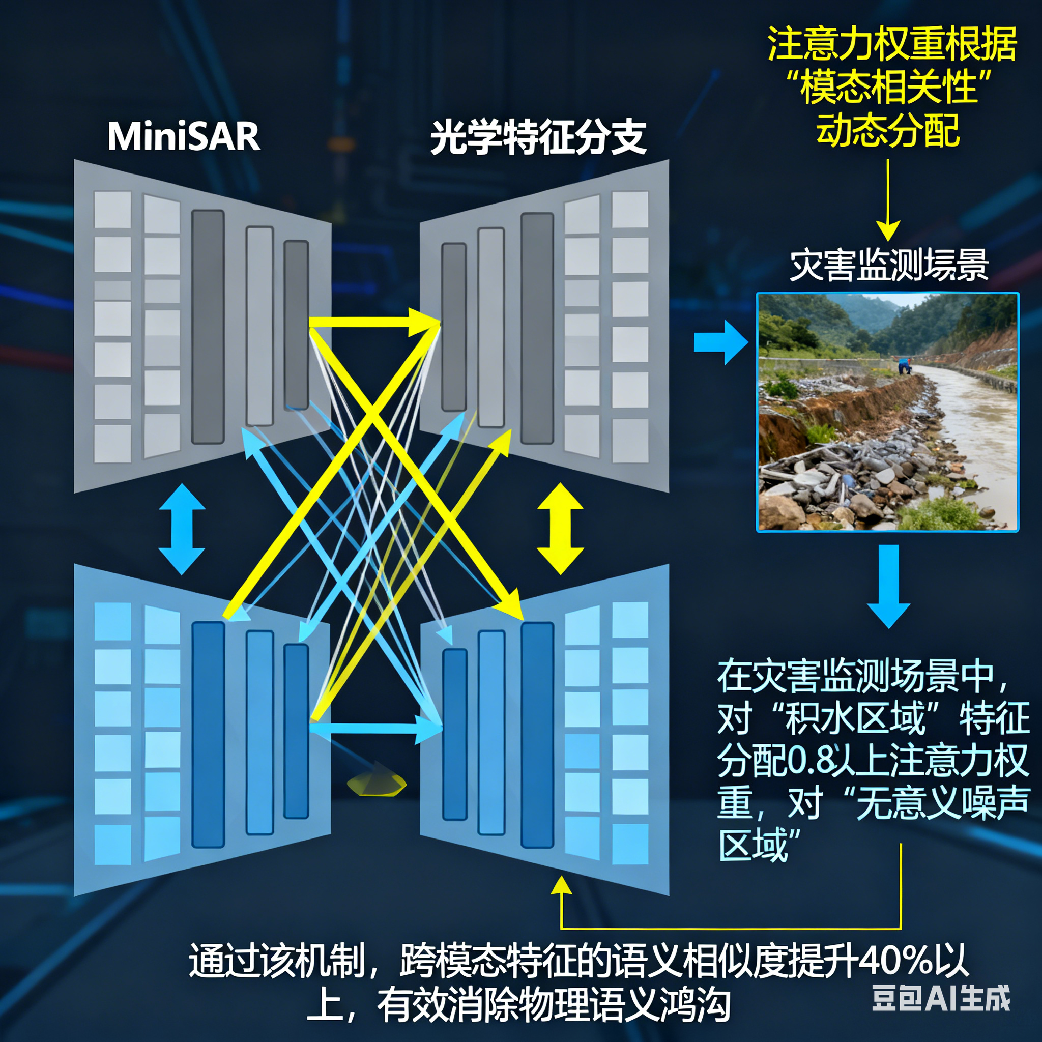 构建双分支注意力网络(如图1),MiniSAR特征分支与光学特征分支通过交叉注意力层实现语义交互:注意力权重根据“模态相关性”动态分配,例如在灾害监测场景中,对“积水区域”特征分配0.8以上注意力权重,对“无意义噪声区域”分配0.2以下权重。通过该机制,跨模态特征的语义相似度提升40%以上,有效消除物理语义鸿沟。